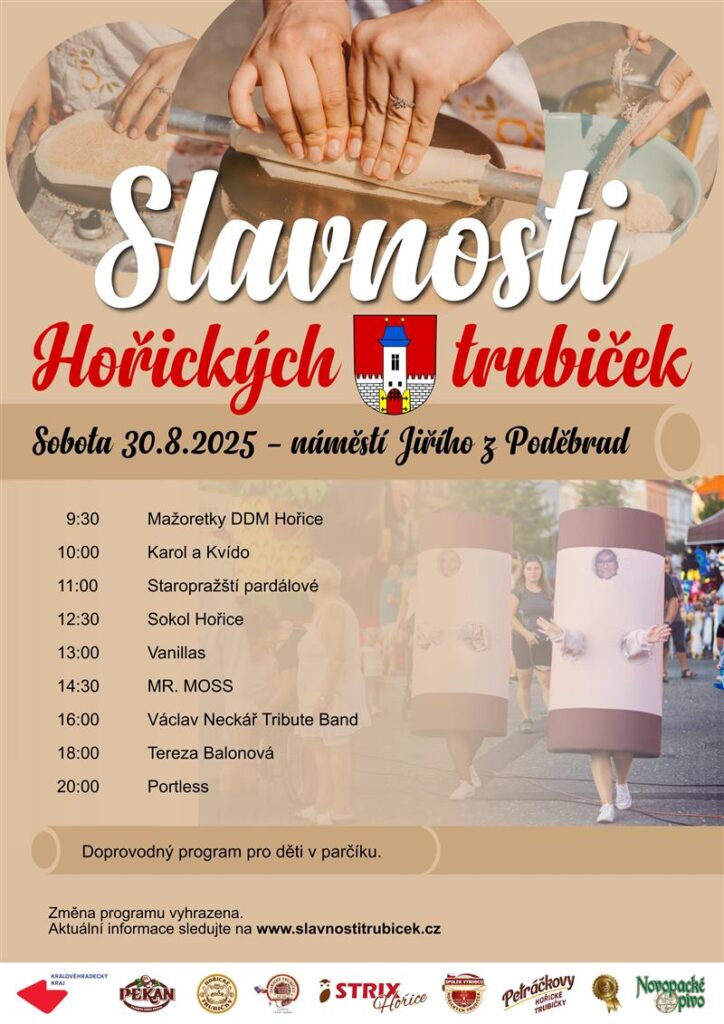 Dvanáctý ročník Slavností Hořických trubiček se uskuteční v sobotu 30. srpna 2025 na náměstí Jiřího z Poděbrad v Hořicích.
